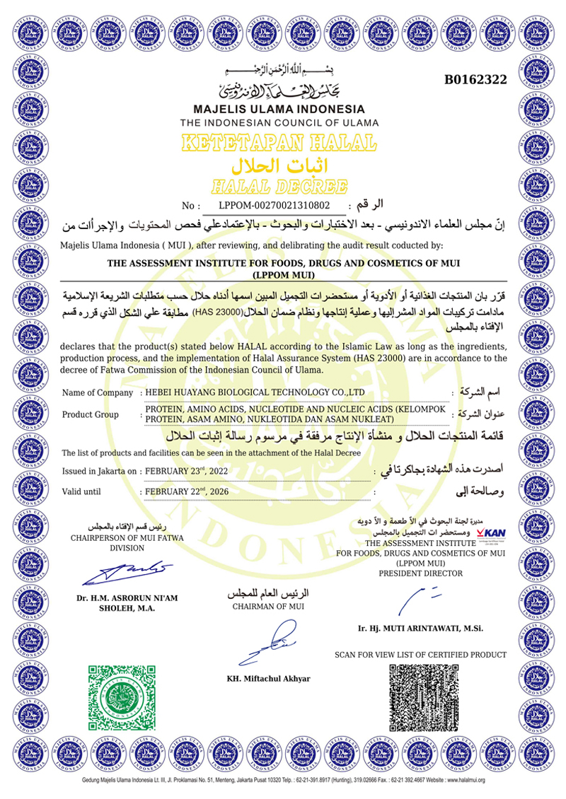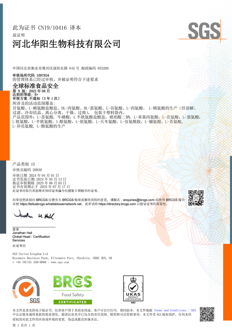 河北華陽集團坐落于河北省衡水市冀州區(qū)省級工業(yè)園區(qū)(始建于1987年,前身為冀州市華陽化工有限責任公司)。集團下屬四個公司:河北華陽生物科技有限公司、河北華悅氨基酸科技有限公司、滄州華晨生物科技有限公司、衡水市陽力商貿有限公司。主要生產甘氨酸、L-丙氨酸、L-蘇氨酸、DL-蛋氨酸、L-賴氨酸鹽酸鹽、L-半胱氨酸鹽酸鹽、干貝素等氨基酸系列食品級產品,廣泛應用于食品、飲料、飼料等行業(yè)。......